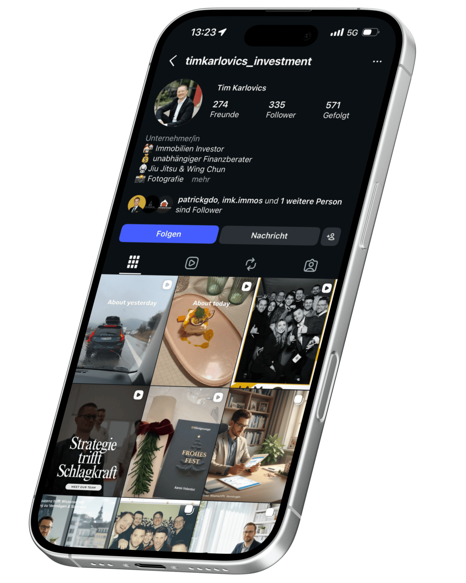 Finde Tim Karlovics in den sozialen Medien auf Instagram und LinkedIn. Hier bekommst Du Einblicke in den Arbeitsalltag von Tim und seinem Team. Zudem erwarten Dich spannende Beiträge rund um die Themem Immobilien als Kapitalanlage, Finanz- und Sparprodukte sowie aktuelle Informationen im Bereich Absicherungen.