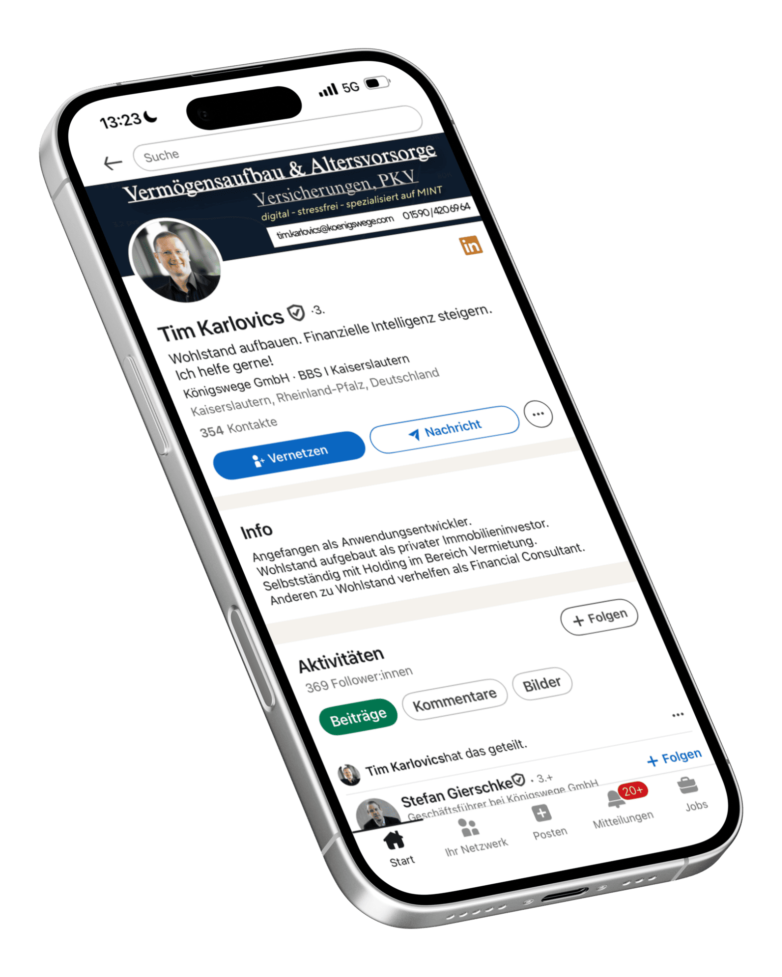 Dein Leben ist individuell – und genau so sollte auch Deine Finanzstrategie sein. Mein Name ist Tim Karlovics und gemeinsam mit meinem Team unterstützen wir Dich dabei, Deine Finanzen sinnvoll zu strukturieren, Absicherungen gezielt einzusetzen und Immobilien als Kapitalanlage im Zusammenspiel mit ETFs strategisch zu bewerten.